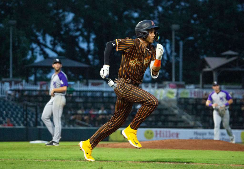 - Bowling Green Hot Rods shortstop Gregory Barrios (3) sprints to first in the Hot Rods’ 5-4 win over the Winston-Salem Dash at the Bowling Green Ballpark on Thursday, July 25, 2024. (Grace Ramey McDowell/grace.ramey@bgdailynews.com)
