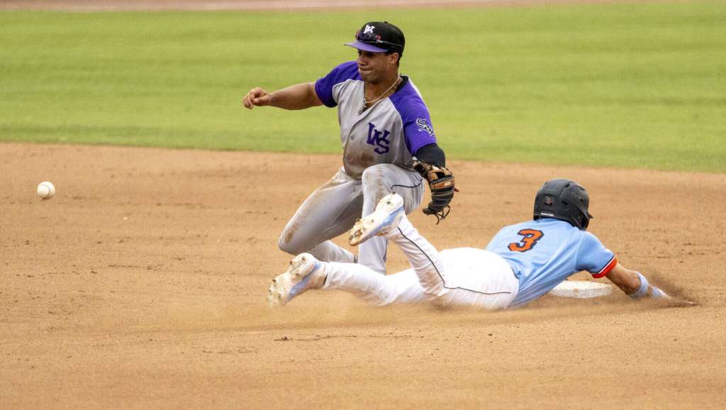- Bowling Green Hot Rods infielder Gregory Barrios (3) slides safely into second base at Winston-Salem Dash infielder Jordan Sprinkle (2) tries to catch a wild throw Sunday, July 28, 2024, during a minor league baseball game at Bowling Green Ballpark in Bowling Green, Ky. (Daily News photo by Joe Imel/joe.imel@bgdailynews.com)