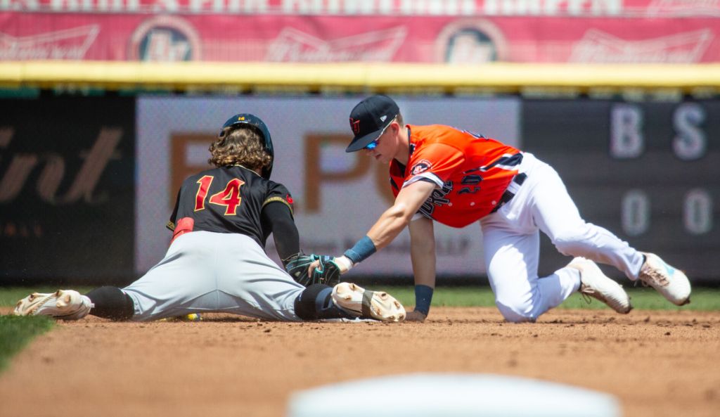 - Bowling Green Hot Rods short stop Brayden Taylor (20) reaches to tag Rome Emperors second baseman Nick Ward (14) as he slides safely into second in the Hot Rods’ 3-2 win over the Emperors at the Bowling Green Ballpark on Wednesday, June 12, 2024. (Grace Ramey McDowell/grace.ramey@bgdailynews.com)