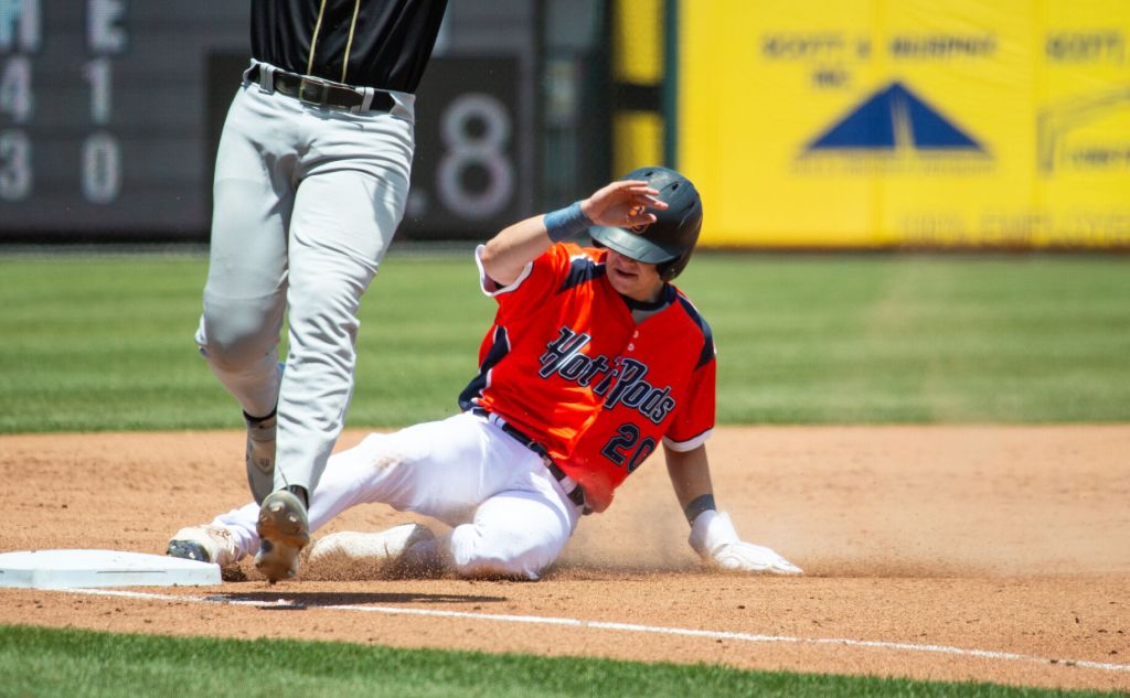 - Bowling Green Hot Rods short stop Brayden Taylor (20) safely slides into third beside Rome Emperors third baseman Sabin Ceballos (23) in the Hot Rods’ 3-2 win over the Emperors at the Bowling Green Ballpark on Wednesday, June 12, 2024. (Grace Ramey McDowell/grace.ramey@bgdailynews.com)