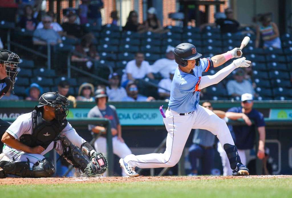 - Bowling Green catcher Kamren James bats during a game between the Bowling Green Hot Rods and Greensboro on Sunday, May 12, 2024 at Bowling Green Ballpark. (Daily News photo by Caleb Lowndes/caleb.lowndes@bgdailynews.com)
